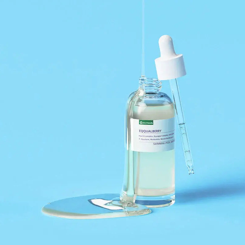 La EQQUALBERRY Swimming Pool Ampoule es un sérum facial de alta hidratación diseñado para calmar la piel y mejorar su textura. Su nombre ("piscina") hace referencia a la sensación de frescura e hidratación profunda que aporta, similar a sumergir la piel en agua.